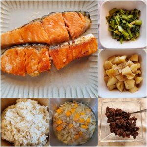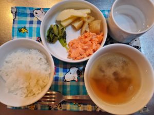 ☆鮭の塩焼き☆玄米入りご飯/白米☆春野菜の味噌汁☆小松菜のおかか和え☆新じゃが芋の煮っ転がし☆レーズン