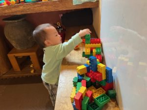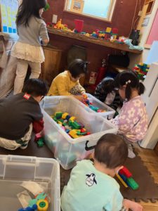 大きい子が作ってたブロックのお家に、ひとつ…ふたつ…とブロックを重ねて満足そうでした😊