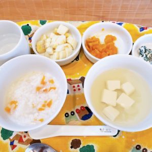☆人参と鶏ささみ粥(軟飯)☆豆腐のすまし汁☆ほうれん草と人参の白和え☆蒸かし南瓜☆バナナ
