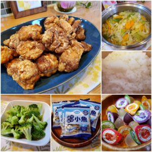 ☆鶏肉の竜田揚げ☆野菜スープ☆ご飯☆ブロッコリー☆ポリポリ小魚☆プチゼリー
