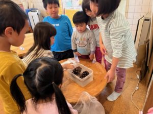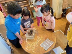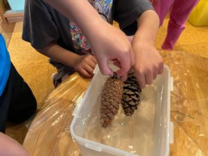松ぼっくりを水につけたらどうなると思う?と、子ども達に投げかけてみると、「色が変わる」「浮く・沈む」「勝手に動く」など色んな意見が出ました😀 さあ、どうなるかな~?