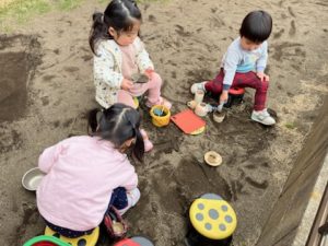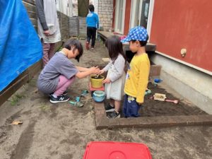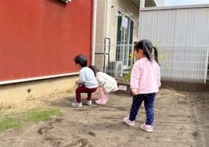 ポツポツの雨はすぐにやみ日が差してきたのでお庭で遊ぶことにしました。