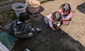 お散歩の後はお庭で遊びました✨雨上がりの土のぬかるみを使って楽しんだり・・・虫探しをして楽しんでいました😊