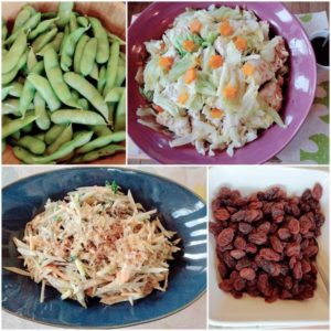 ☆枝豆☆高原キャベツと鶏ひき肉の重ね蒸し☆新ごぼうと人参のサラダ☆レーズン