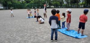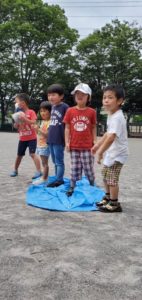 2枚のブルーシート(陣地)に1チームずつ分かれ1回ずつ代表者が出て相手とじゃんけんをしてその勝敗によって陣地の範囲が小さくなってしまった方が負けという内容で遊びました♪