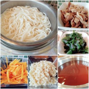 トッピングうどん(うどん、豚肉炒め、ワカメ、人参、天かす、つゆ)