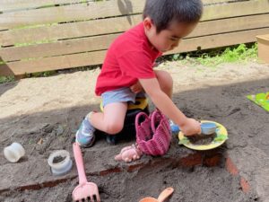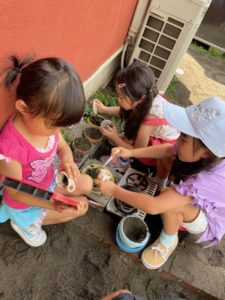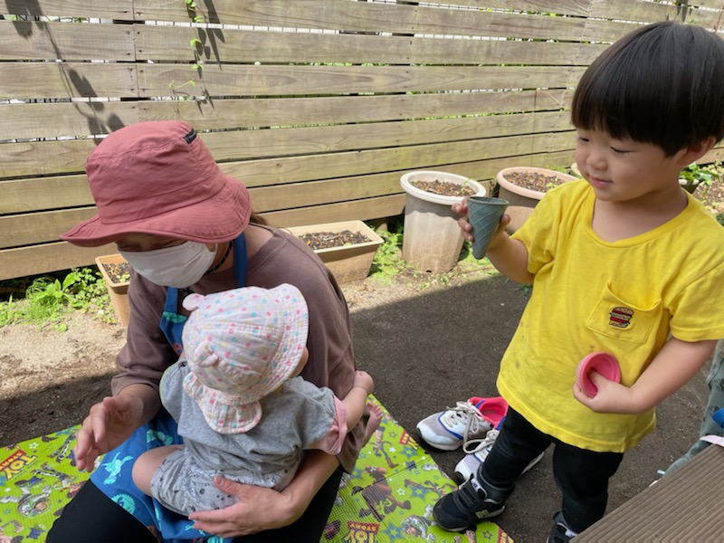 今日はお庭で過ごしました。アイスやピザなど色々な料理を作って持ってきてくれる子ども達。0歳児のお友達にも届けに来てくれました。