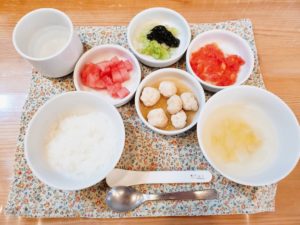 ☆軟飯/5倍粥☆大根とコーンのスープ☆鶏肉団子のだし煮☆茹でキャベツののり添え☆刻みミニトマト☆スイカ