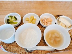 【後期】軟飯/5倍粥 お麩のみそ汁 サーモンの煮魚 茹でブロッコリー さつま芋のだし煮 バナナ
