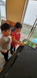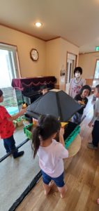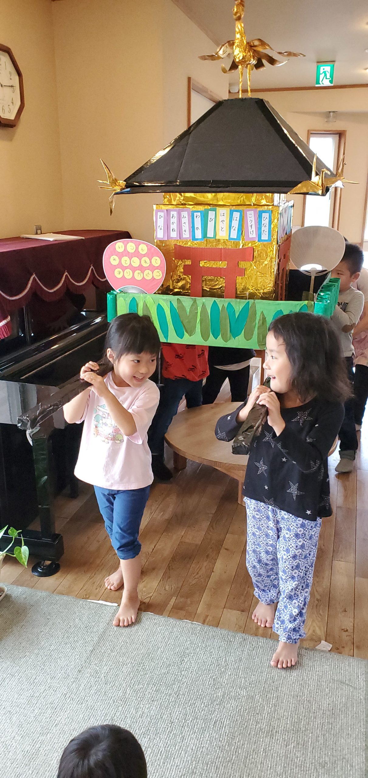 みんなでコツコツ作り上げてきたお神輿がついに今日、完成の日を迎えました!年長さんが最後の仕上げに、お神輿に込める思いを書いたうちわと、鳳凰を守る4羽の鶴を飾り完成しました。明日の七夕祭りでは(晴れれば)お神輿を担いで練り歩く予定なので試しに担いでみました。担ぎ方も様になっていますね!