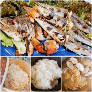 ☆カマスの塩焼き☆サーモン塩焼き☆アサリのみそ汁☆玄米入りご飯☆白米