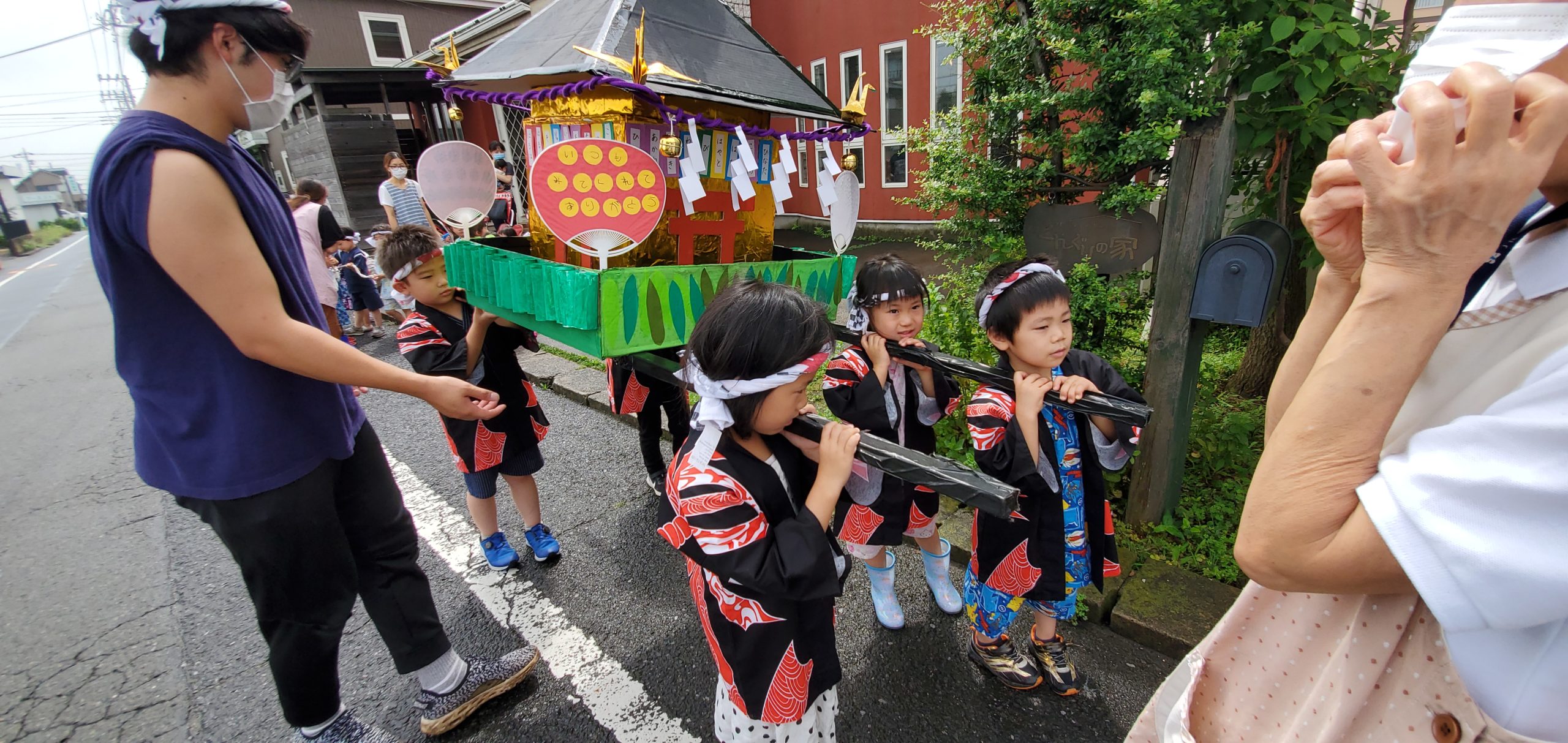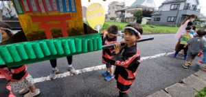 そんな願いとは裏腹に、今朝は雨がパラつき、“練り歩きは延期かぁ”と半ばあきらめかけていました。しかし、朝の集いが終わる頃、雨がピタリとやんで空が明るくなってきました。「よし!行くぞ!」急いでみんなで準備を整え外に出ると日差しも出てきて、これから練り歩きに出かける子ども達を応援してくれているようでした。さぁ出発だ!!❝わっしょい わっしょい❞