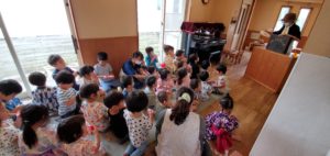 昔ながらの紙芝居屋さんのように駄菓子を食べながら紙芝居を楽しむ子ども達でした。