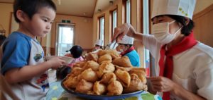 部屋に戻り一息ついていると、♪プープッププー♪と何やら愉快なラッパの音がして紙芝居屋さんがやってきてくれました。10円を持って自分で駄菓子を買うと、紙芝居の始まり始まり~。