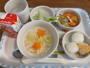 ☆七夕そーめん☆コロコロ2色おにぎり☆2種のお焼き☆スティック野菜☆ジュース☆スイカ