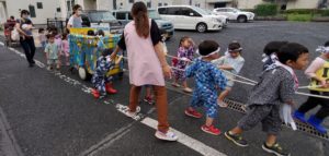 お神輿の後ろからは年中さんが山車を引いて❝わっしょい わっしょい❞と盛り上げます。