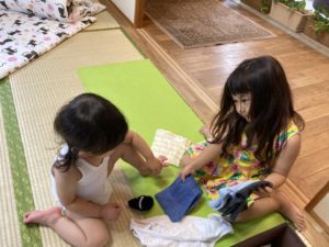 年中さんが着替えで困っている自分より小さい子のお手伝いをしている様子です♪