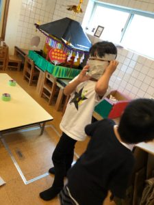 「なにそれ」と聞くと「忍者だよ」と忍者のイメージに沿って作っていました😊その後、「口塞いでないから大丈夫だよ!」と安全面も考えて作っていましたΣ(・□・)