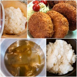 ☆玄米入りご飯☆コロッケと千切りキャベツ☆わかめと舞茸のスープ☆白米