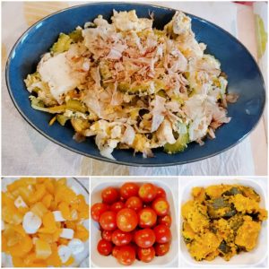 ☆ゴーヤチャンプルー☆フルーツミックス(バナナ、みかん、黄桃)☆ミニトマト☆南瓜の煮物