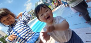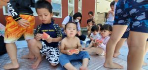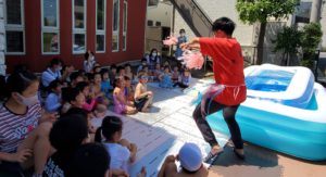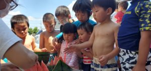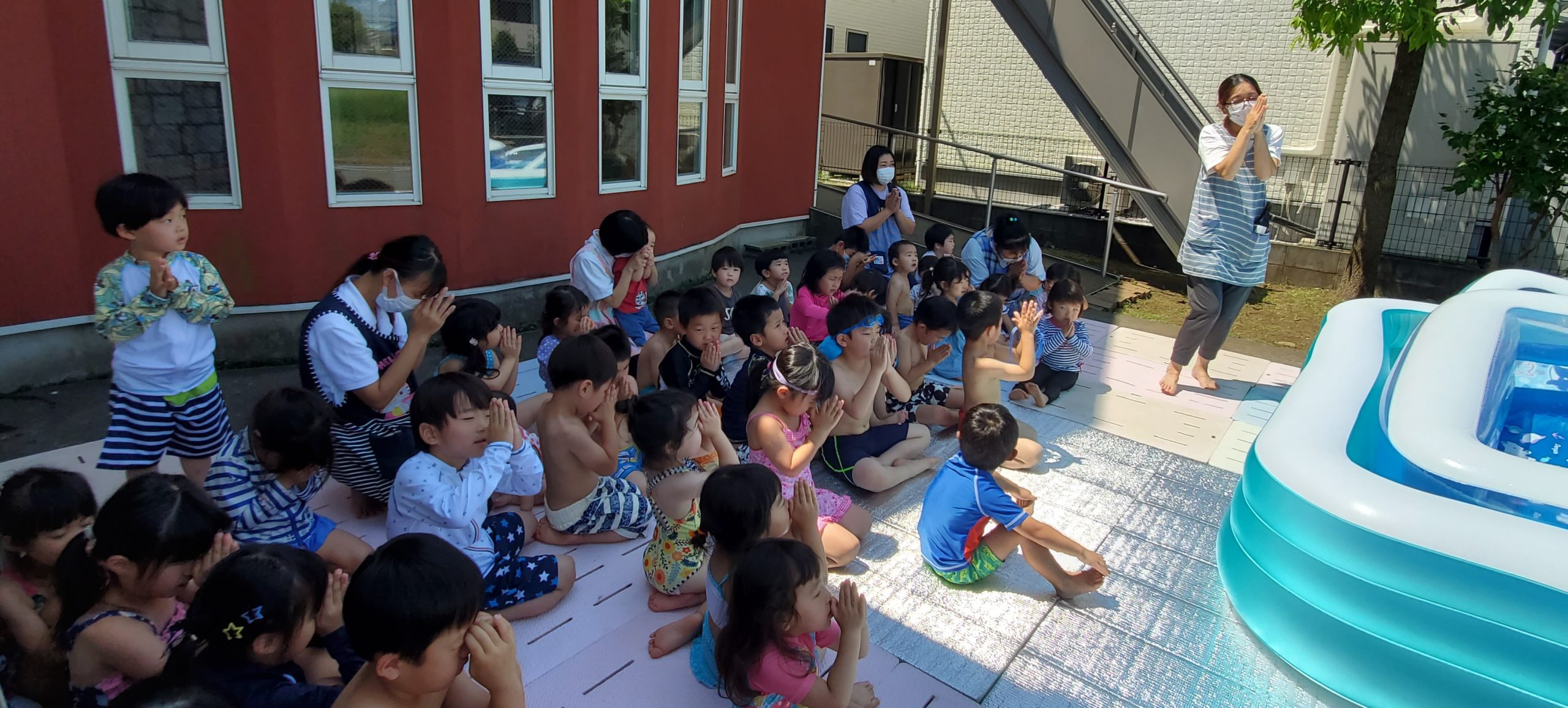 梅雨が明け、子ども達はこの日をずっと待ちわびていたことでしょう。朝からプールの準備が始まると「まだかなぁ~」と目が離せない様子でした。この夏も安全にプールが楽しめるよう準備の仕方やプールに入る時の確認や注意点などを子ども達と話し合いました。みんな水着に着替えプールの前に集合!プール開きを行いました。初めにみんなを代表して年長さんにお清めの塩とお酒をまいてもらいました。そして水の神様に「いつも見守っていてください!」とお願いをすると、空から水が降ってきて…きっと神様からのお返事だったのかもしれません…。子ども達の体調に気を配り、安全にプール遊びが出来るよう準備をしていきたいと思います。