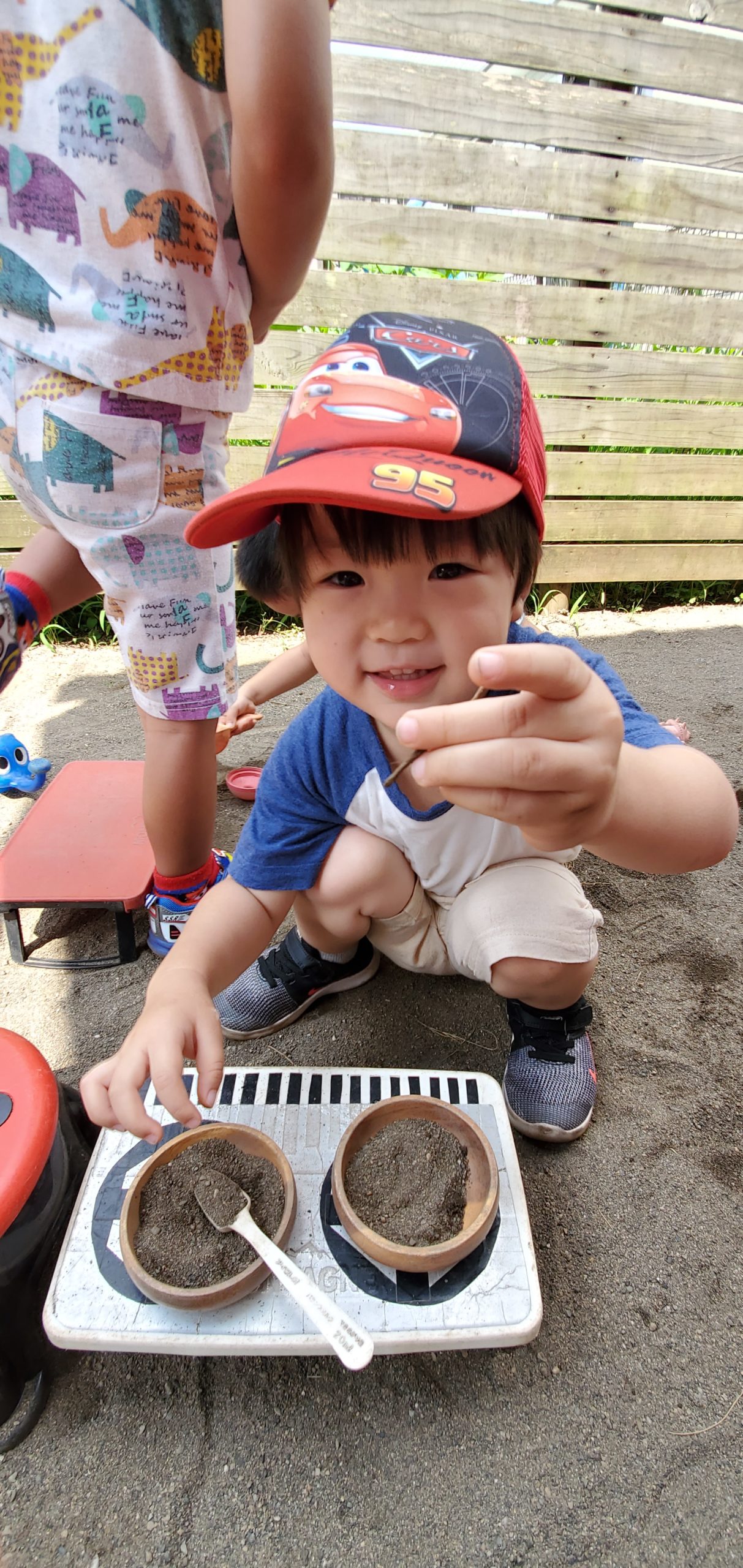 今日のお庭は日陰と風もあって過ごしやすく、砂場遊びが楽しめました。2歳児の男の子はすぐにお皿を用意して、お料理にとりかかり、おもてなしをしてくれました♪お茶碗とお椀を上手に並べると、スプーンがないことに気が付いて取りに向かいます。戻ってくると、そっとスプーンの柄を相手にむけて置いてくれました🥄遊びの中で普段の生活が生かされている事や、相手を想う優しさが伝わるほっこりとした場面でした😊