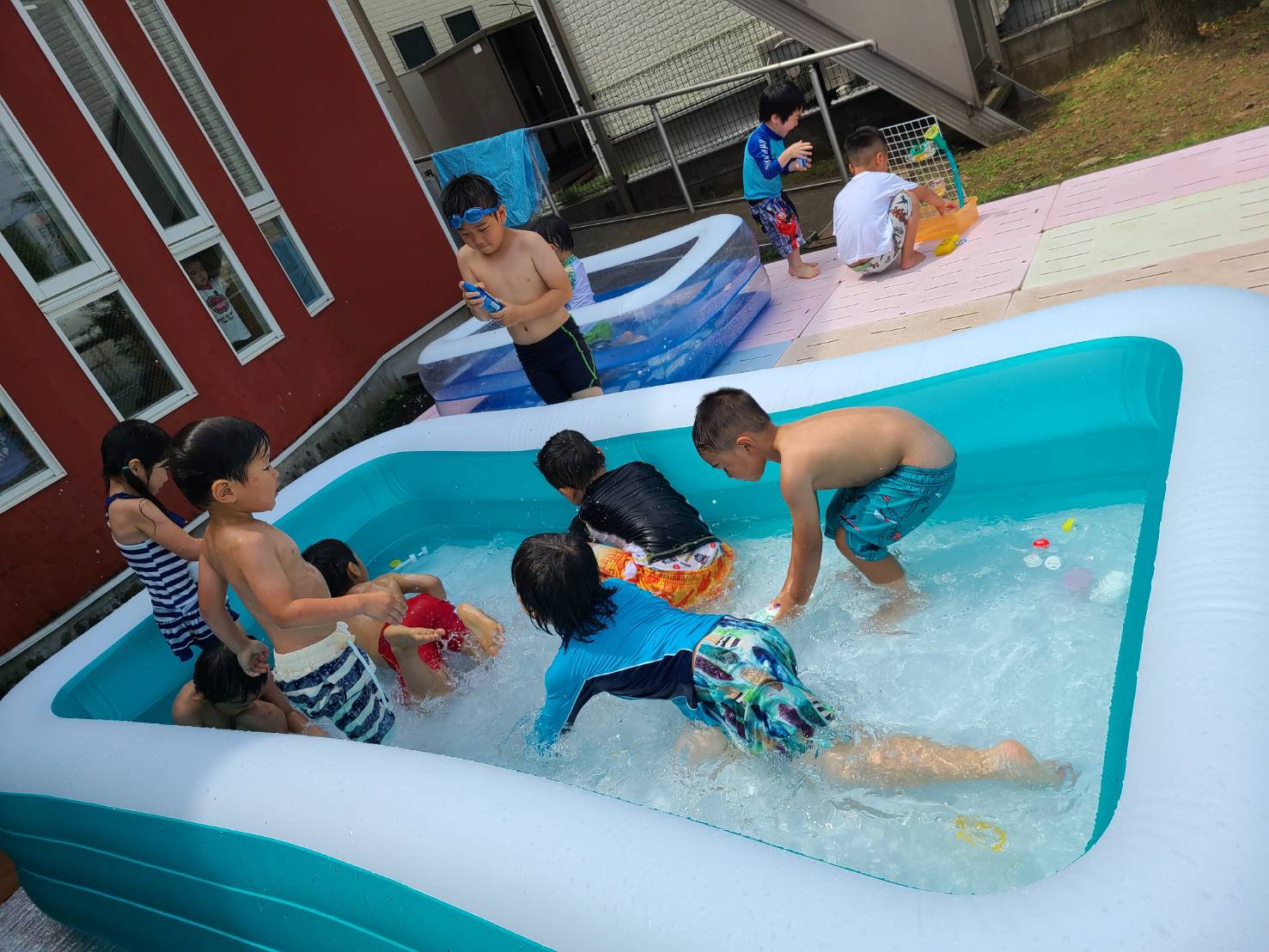 日に日に暑さが厳しくなってきましたね。朝からプールの準備をしていると部屋の窓から様子をじっと見つめている子ども達です。それぞれプールに入る支度を終えると、体操をして準備OK!喜んで水に触れ楽しそうな声が響き渡っています☺