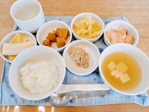 ◎軟飯/5倍粥◎豆腐の味噌汁◎焼き鮭◎納豆◎南瓜の煮物◎マカロニサラダ◎バナナ