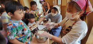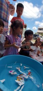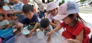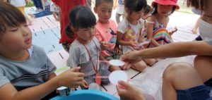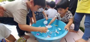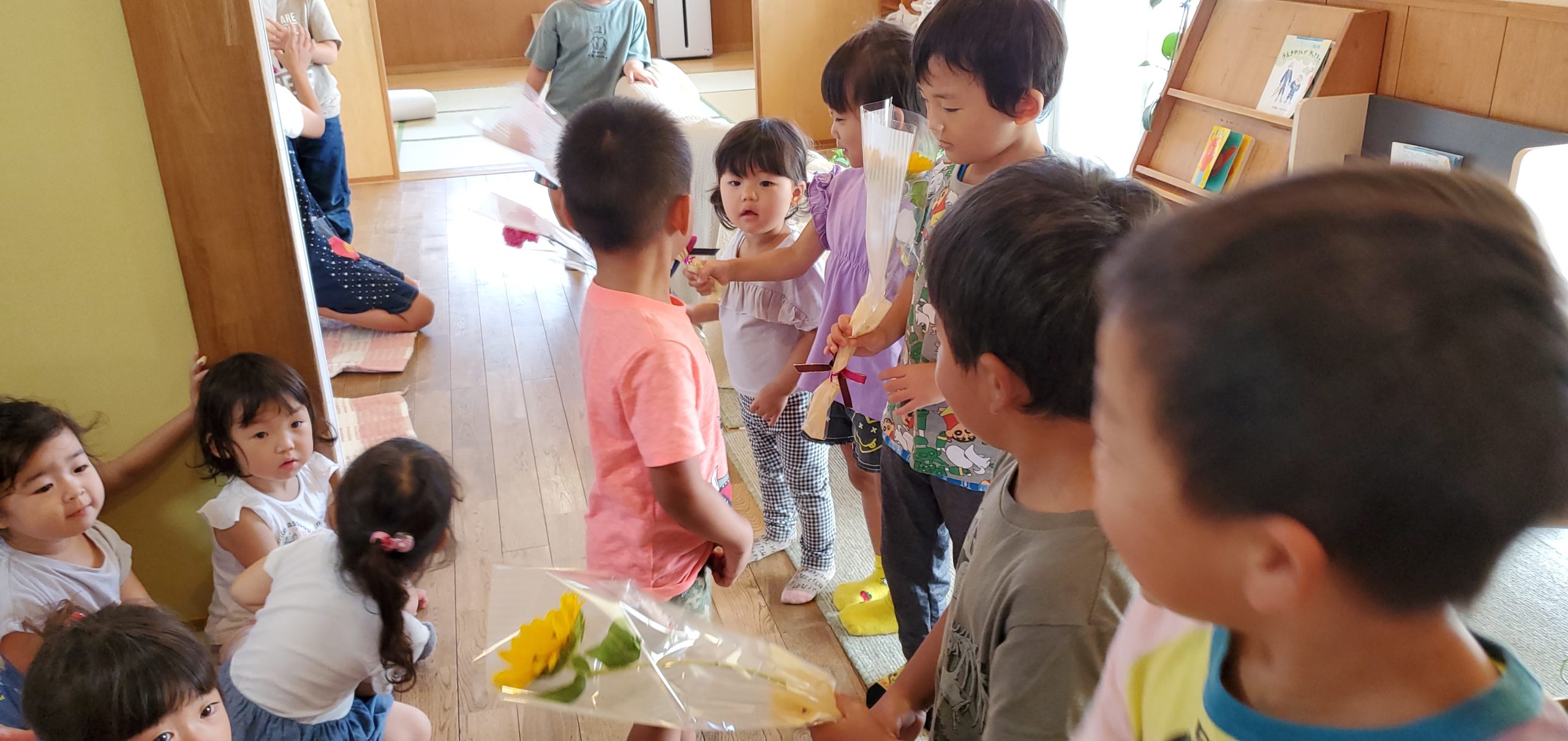 今日は6・7月生まれのお友達のお誕生日会を開きました。初めにお誕生日のお友達にお花のプレゼント💐渡す方も受け取る方もちょっぴり照れくさそうにしていましたが、受け取ったあとは満面の笑みがこぼれていました。バースデーメダルをもっと素敵にしちゃおう!という事で、みんなで金魚すくいや水鉄砲にチャレンジして素敵アイテムをgetしてメダルを完成させました。