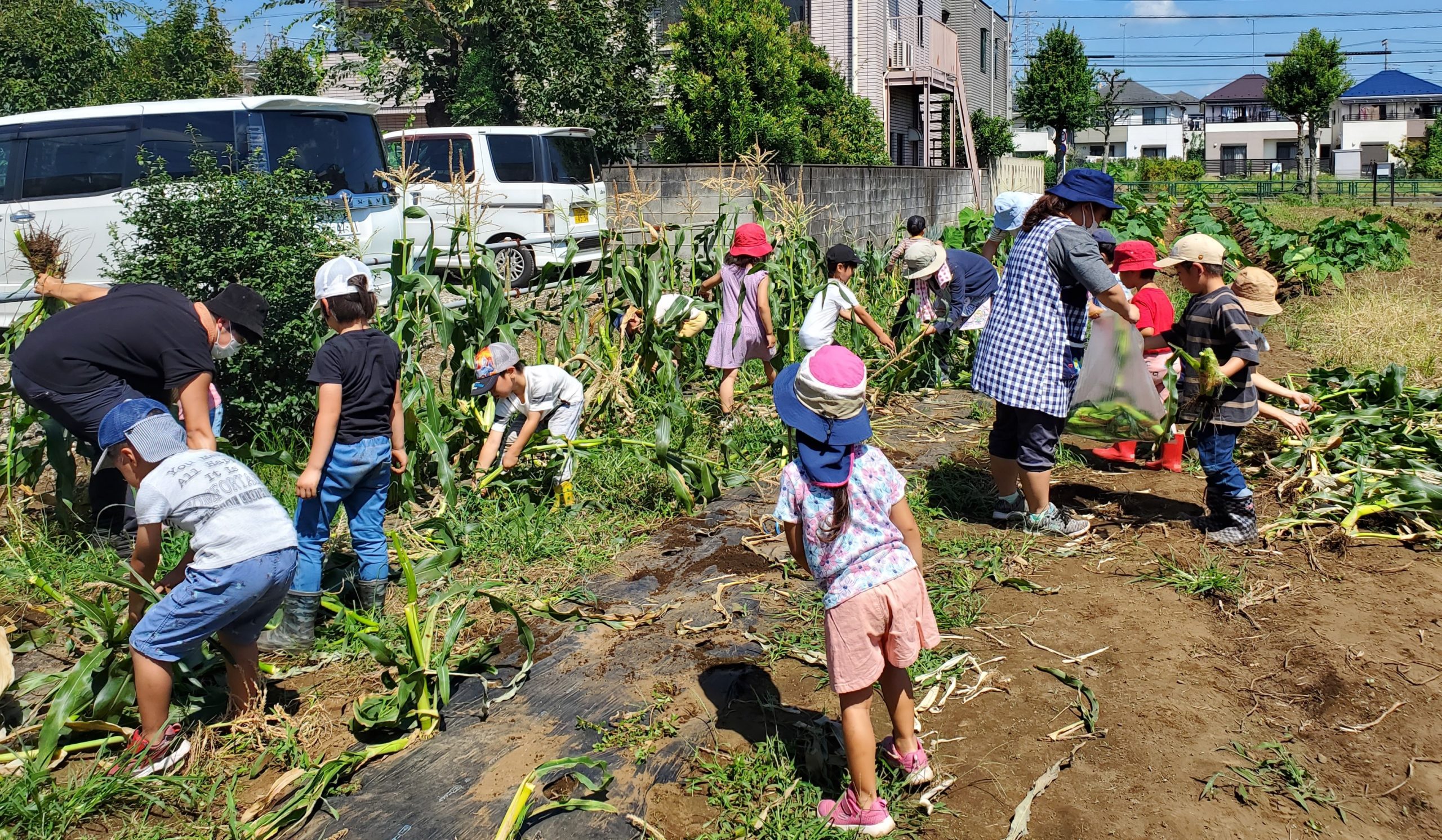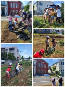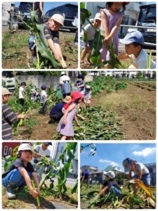 4.5歳児の子ども達が毎日様子をみて大切に育ててくれたとうもろこし。この夏はたくさん頂くことが出来ました。ありがとう。今日は畑の片づけを行いました。とうもろこしは根がしっかり張っているので、子ども達が〝う~ん〟と力いっぱい引っ張ってもなかなか抜けませんでした。なので「おーい誰か手伝ってー」と声を掛け合いながら引っ張っていました。引き抜いたとうもろこしは畑の栄養にするため日に当てて乾燥させます。最初から最後まで行うことで〝生きること〟〝生きているということ〟〝次の野菜に命が引き継がれていくこと〟を学んでいけたらと思います。