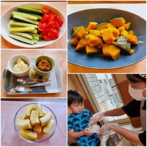☆ほかほかおにぎり☆きゅうりスティック(味噌 マヨネーズ)☆ミニトマト☆南瓜の煮物☆バナナ