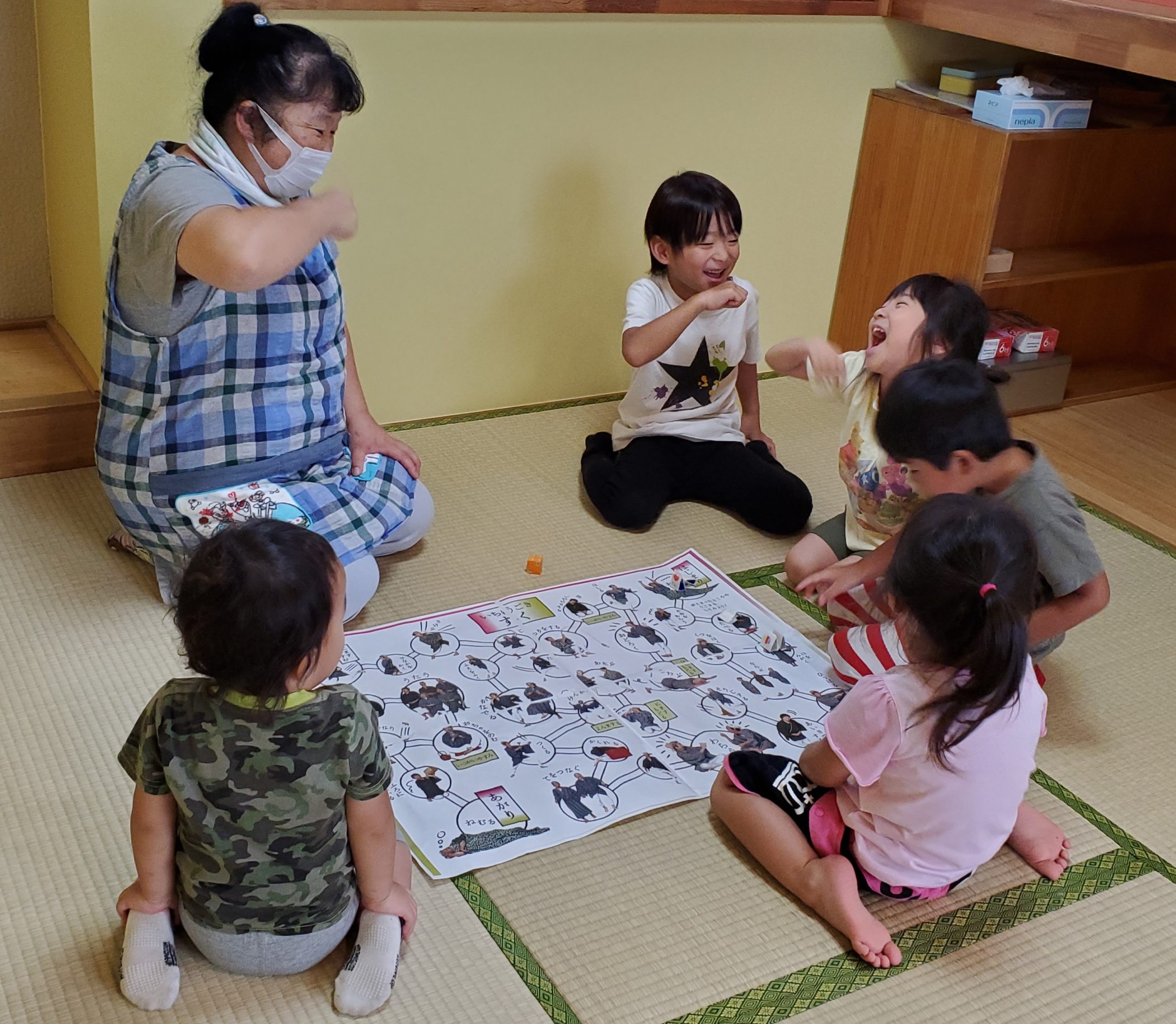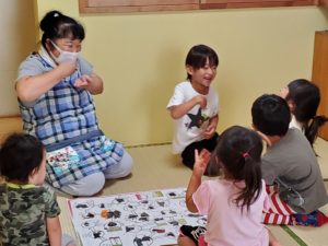 次は〝食べる〟だぁ(*’▽’) その他にも〝並ぶ〟〝引っ張る〟〝寝る(1回やすみ💦)〟など、一日の中の色んな動きを楽しんでいる子ども達でした。