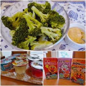 ♦ブロッコリー味噌マヨ添え♦カップゼリーorカップヨーグルト♦ジュース(りんご/ぶどう/みかん)