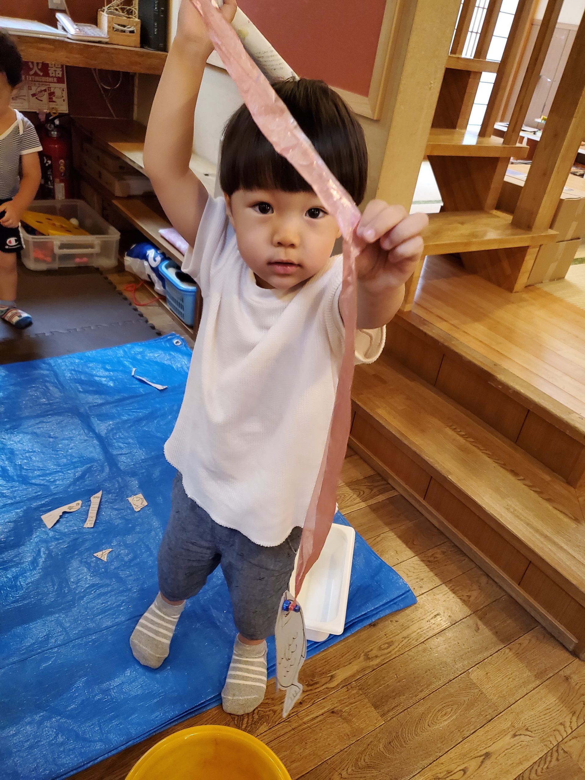 お盆休み期間最終日はさかな釣りで盛り上がりました!魚やタコ、クラゲにクジラ、「ペンギンも!」…まあ釣っちゃいましょう(笑)色んな魚を作り釣竿を作り夢中になって遊んでいました。今日は大漁だったね >゜)))彡
