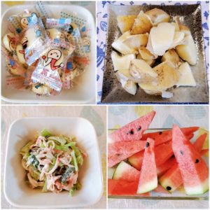 ☆蒸かしじゃが芋☆小松菜とカニカマの胡麻サラダ☆キャンディーチーズ☆スイカ
