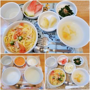 【後期/完了期】☆トマトとツナのパスタ☆野菜コンソメスープ☆手作りパン☆小松菜おかか和え☆蒸かしじゃが芋☆スイカ