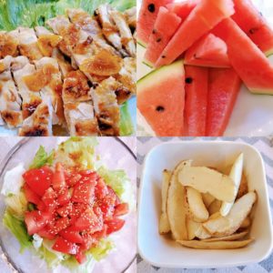 ☆チキンのソテー☆スイカ☆レタスとトマトのさっぱりサラダ☆ポテトフライ