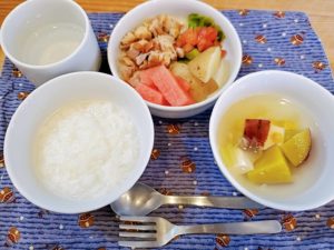 ☆軟飯☆キャベツのスープ☆チキンの柔らかソテー☆蒸かしじゃが芋☆レタスとトマトのサラダ☆スイカ