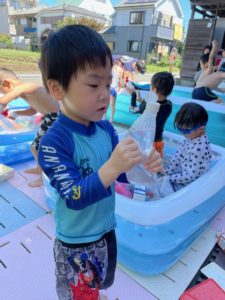 どうやったら水を噴射させることが出来るのか上を押したり下を押したり試行錯誤している様子です。