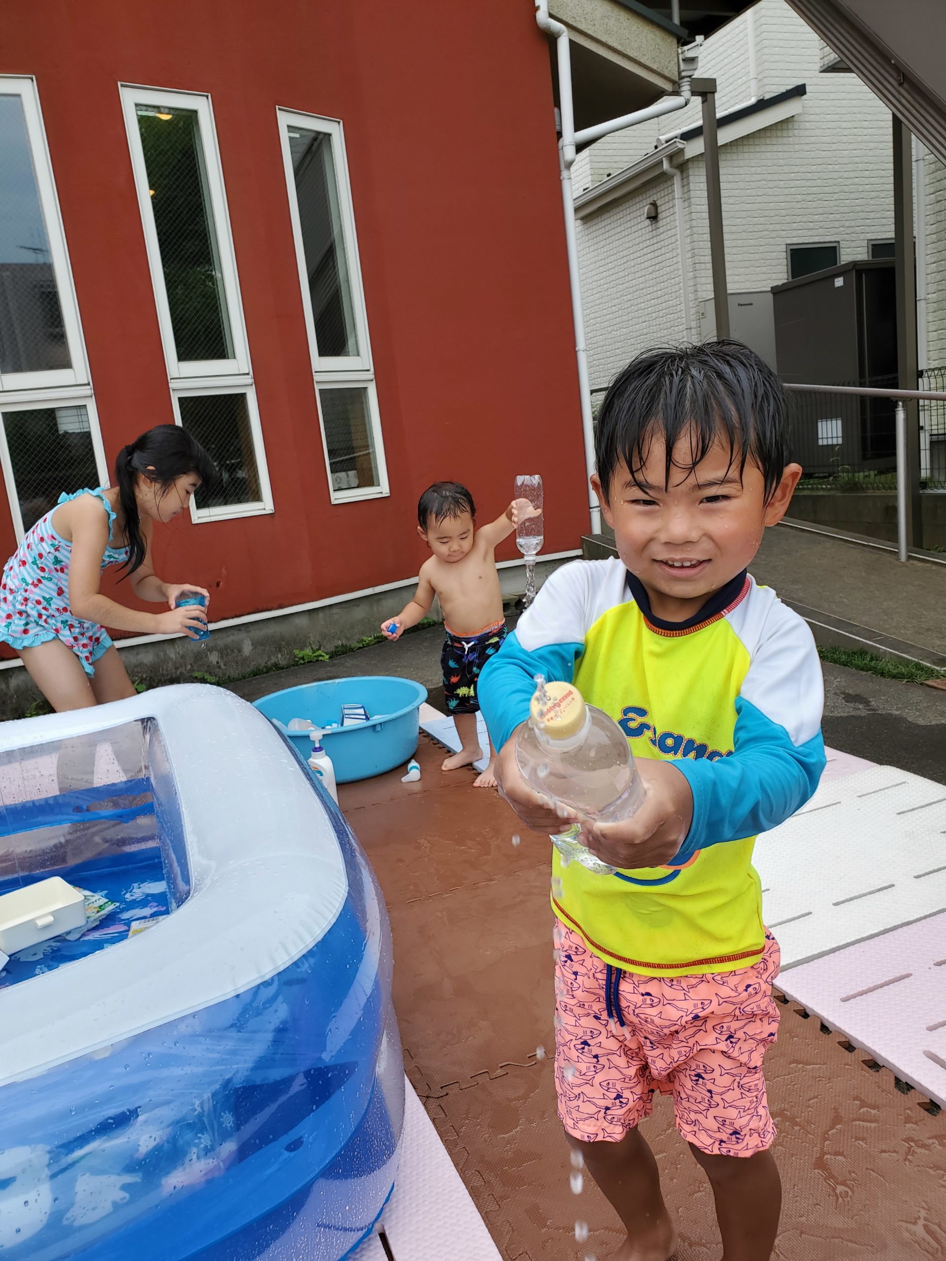 今日も蒸し暑い一日でしたね。「今日何して過ごそうか?水遊びする?」と提案すると目がキラッ✨と輝きパッと支度を済ませていました。ペットボトルの水鉄砲を掛け合ったり的当てゲームを楽しんだりしていました。「あ~楽しかった♪」と満足そうでした!