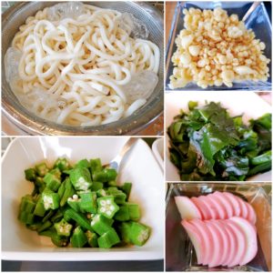 ☆冷やしうどん(トッピング:オクラ 天かす ワカメ かまぼこ)