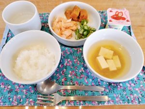 【後期/完了期】☆軟飯/5倍粥☆豆腐の味噌汁☆鮭のだし煮☆きゅうりとオクラのおかか和え☆蒸かし南瓜☆ベビーダノン