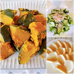 ☆南瓜の甘煮☆きゅうりとオクラのおかか和え☆グレープフルーツ
