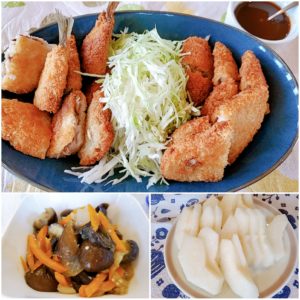 ☆ミックスフライ(白身魚、鯵)☆千切りキャベツ☆茄子と人参と玉葱の味噌炒め☆梨