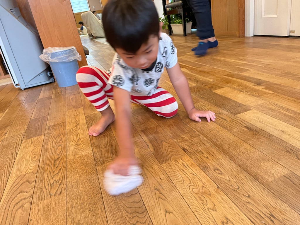 「おれ明日お休みだよ!」と得意気に言うのは3歳児の男の子。お休みの日は家族との大切な時間だもんね(^^♪ お部屋のお掃除も気合を入れてピカピカにしてくれました。雑巾を絞るのも上手になってきました。