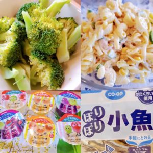 ☆茹でブロッコリー☆マカロニサラダ☆カップゼリー☆ポリポリ小魚