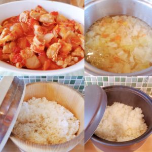 ☆鶏肉のトマト煮☆具だくさん野菜スープ☆玄米入りご飯☆白米
