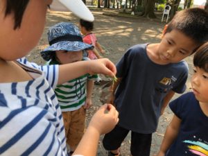 カマキリの姿に興味を持って近づきますが、触れられない子が多く恐る恐る見る姿が可愛かったです♪