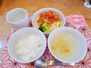 ☆軟飯☆具だくさん野菜スープ☆鶏肉のトマト煮☆マカロニサラダ☆茹でブロッコリー☆ベビーダノン