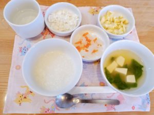 【中期】○7倍粥○豆腐と小松菜のみそ汁上澄み○煮魚(鯛)○大根と人参のだし煮○バナナ